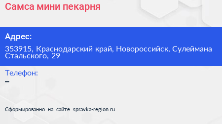 Самса, мини-пекарня по адресу 353915, Краснодарский край, Новороссийск, Сулеймана Стальского, 29 в дальнейшем Организация, размещена в следующих категориях: