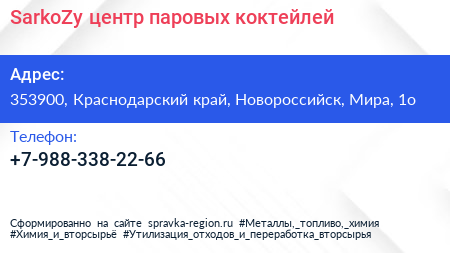 SarkoZy, центр паровых коктейлей по адресу 353900, Краснодарский край, Новороссийск, Мира, 1о в дальнейшем Организация, размещена в следующих категориях: