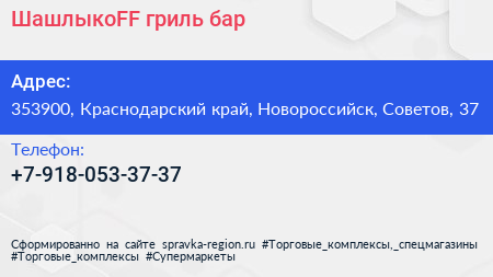 ШашлыкоFF, гриль-бар по адресу 353900, Краснодарский край, Новороссийск, Советов, 37 в дальнейшем Организация, размещена в следующих категориях: