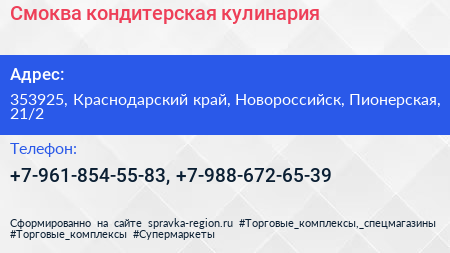Смоква, кондитерская-кулинария по адресу 353925, Краснодарский край, Новороссийск, Пионерская, 21/2 в дальнейшем Организация, размещена в следующих категориях: