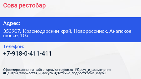 Сова, рестобар по адресу 353907, Краснодарский край, Новороссийск, Анапское шоссе, 10а в дальнейшем Организация, размещена в следующих категориях:
