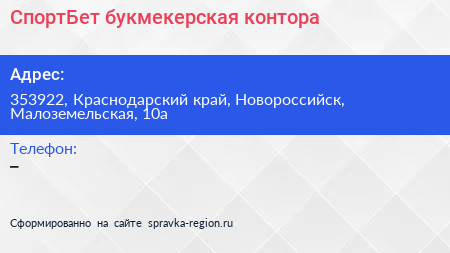 СпортБет, букмекерская контора по адресу 353922, Краснодарский край, Новороссийск, Малоземельская, 10а в дальнейшем Организация, размещена в следующих категориях: