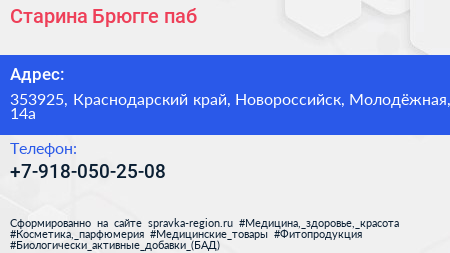 Старина Брюгге, паб по адресу 353925, Краснодарский край, Новороссийск, Молодёжная, 14а в дальнейшем Организация, размещена в следующих категориях: