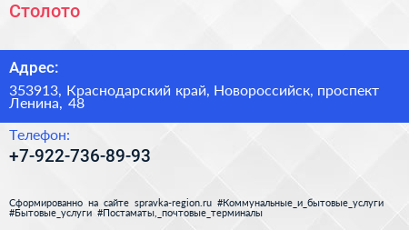 Столото по адресу 353913, Краснодарский край, Новороссийск, проспект Ленина, 48 в дальнейшем Организация, размещена в следующих категориях:
