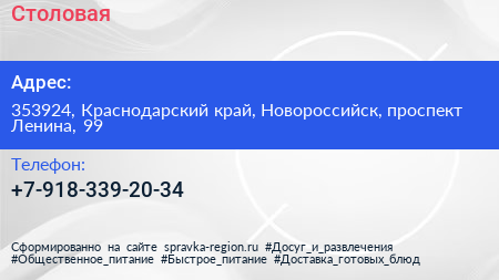 Столовая по адресу 353924, Краснодарский край, Новороссийск, проспект Ленина, 99 в дальнейшем Организация, размещена в следующих категориях: