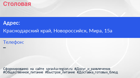 Столовая по адресу Краснодарский край, Новороссийск, Мира, 15а в дальнейшем Организация, размещена в следующих категориях: