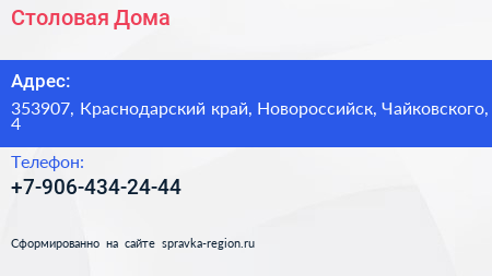 Столовая Дома по адресу 353907, Краснодарский край, Новороссийск, Чайковского, 4 в дальнейшем Организация, размещена в следующих категориях: