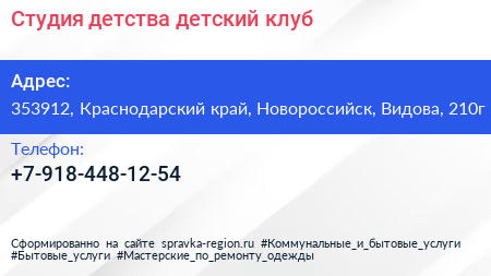 Студия детства, детский клуб по адресу 353912, Краснодарский край, Новороссийск, Видова, 210г в дальнейшем Организация, размещена в следующих категориях: