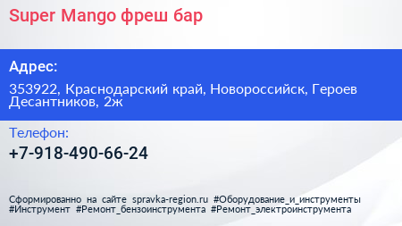 Super Mango, фреш-бар по адресу 353922, Краснодарский край, Новороссийск, Героев Десантников, 2ж в дальнейшем Организация, размещена в следующих категориях: