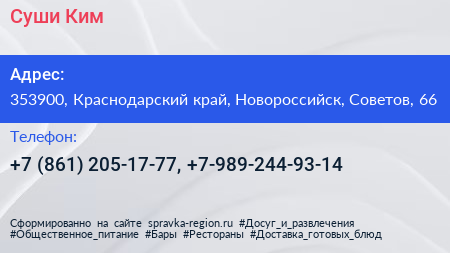 Суши Ким по адресу 353900, Краснодарский край, Новороссийск, Советов, 66 в дальнейшем Организация, размещена в следующих категориях:
