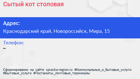Сытый кот, столовая по адресу Краснодарский край, Новороссийск, Мира, 15 в дальнейшем Организация, размещена в следующих категориях: