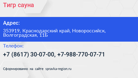 Тигр, сауна по адресу 353919, Краснодарский край, Новороссийск, Волгоградская, 11Б в дальнейшем Организация, размещена в следующих категориях: