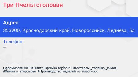 Три Пчелы, столовая по адресу 353900, Краснодарский край, Новороссийск, Леднёва, 5а в дальнейшем Организация, размещена в следующих категориях: