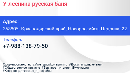 У лесника, русская баня по адресу 353905, Краснодарский край, Новороссийск, Цедрика, 22 в дальнейшем Организация, размещена в следующих категориях: