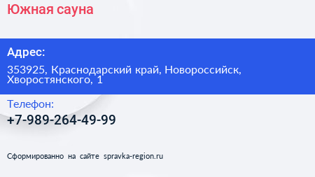 Южная, сауна по адресу 353925, Краснодарский край, Новороссийск, Хворостянского, 1 в дальнейшем Организация, размещена в следующих категориях: