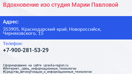 Вдохновение, изо-студия Марии Павловой по адресу 353905, Краснодарский край, Новороссийск, Черняховского, 15 в дальнейшем Организация, размещена в следующих категориях: