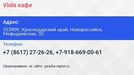 Viola, кафе по адресу 353909, Краснодарский край, Новороссийск, Мефодиевская, 32 в дальнейшем Организация, размещена в следующих категориях:
