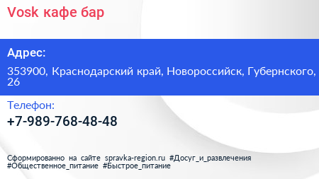 Vosk, кафе-бар по адресу 353900, Краснодарский край, Новороссийск, Губернского, 26 в дальнейшем Организация, размещена в следующих категориях: