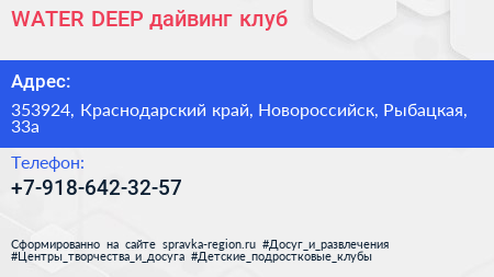 WATER DEEP, дайвинг-клуб по адресу 353924, Краснодарский край, Новороссийск, Рыбацкая, 33а в дальнейшем Организация, размещена в следующих категориях: