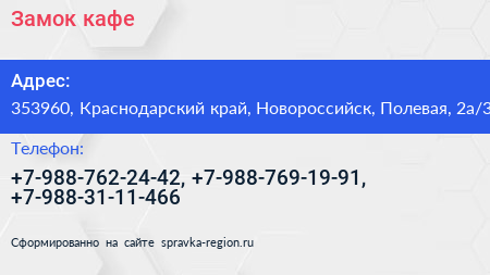 Замок, кафе по адресу 353960, Краснодарский край, Новороссийск, Полевая, 2а/3 в дальнейшем Организация, размещена в следующих категориях: