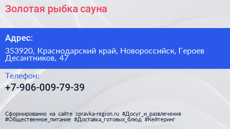 Золотая рыбка, сауна по адресу 353920, Краснодарский край, Новороссийск, Героев Десантников, 47 в дальнейшем Организация, размещена в следующих категориях: