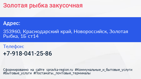 Золотая рыбка, закусочная по адресу 353960, Краснодарский край, Новороссийск, Золотая Рыбка, 1Б ст14 в дальнейшем Организация, размещена в следующих категориях: