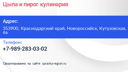Цыпа и пирог, кулинария по адресу 353900, Краснодарский край, Новороссийск, Кутузовская, 6а в дальнейшем Организация, размещена в следующих категориях: