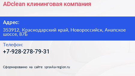 ADclean, клининговая компания по адресу 353912, Краснодарский край, Новороссийск, Анапское шоссе, 87Б в дальнейшем Организация, размещена в следующих категориях: