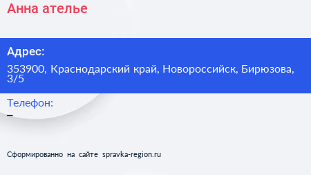 Анна, ателье по адресу 353900, Краснодарский край, Новороссийск, Бирюзова, 3/5 в дальнейшем Организация, размещена в следующих категориях: