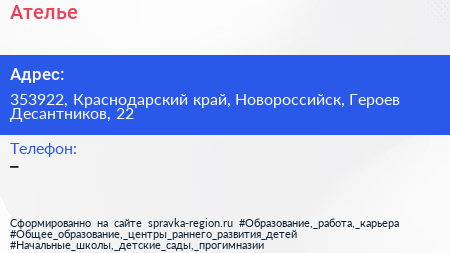 Ателье по адресу 353922, Краснодарский край, Новороссийск, Героев Десантников, 22 в дальнейшем Организация, размещена в следующих категориях: