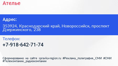 Ателье по адресу 353924, Краснодарский край, Новороссийск, проспект Дзержинского, 238 в дальнейшем Организация, размещена в следующих категориях: