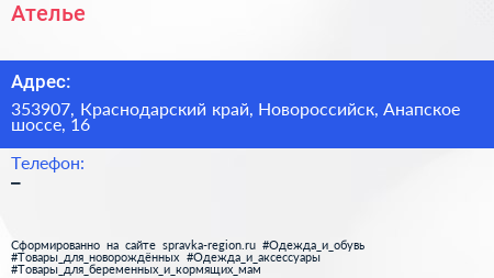 Ателье по адресу 353907, Краснодарский край, Новороссийск, Анапское шоссе, 16 в дальнейшем Организация, размещена в следующих категориях: