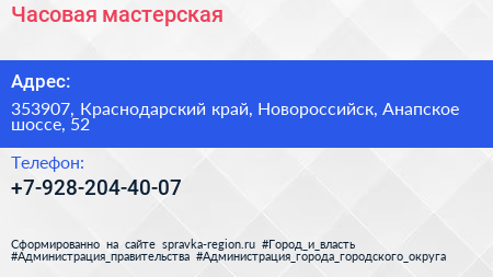 Часовая мастерская по адресу 353907, Краснодарский край, Новороссийск, Анапское шоссе, 52 в дальнейшем Организация, размещена в следующих категориях: