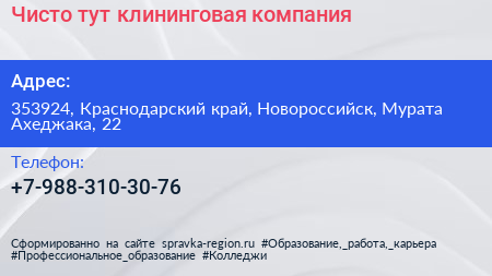 Чисто тут, клининговая компания по адресу 353924, Краснодарский край, Новороссийск, Мурата Ахеджака, 22 в дальнейшем Организация, размещена в следующих категориях: