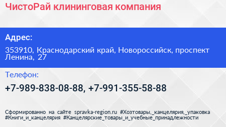 ЧистоРай, клининговая компания по адресу 353910, Краснодарский край, Новороссийск, проспект Ленина, 27 в дальнейшем Организация, размещена в следующих категориях: