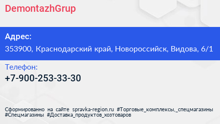 DemontazhGrup по адресу 353900, Краснодарский край, Новороссийск, Видова, 6/1 в дальнейшем Организация, размещена в следующих категориях: