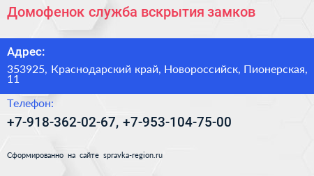 Домофенок, служба вскрытия замков по адресу 353925, Краснодарский край, Новороссийск, Пионерская, 11 в дальнейшем Организация, размещена в следующих категориях: