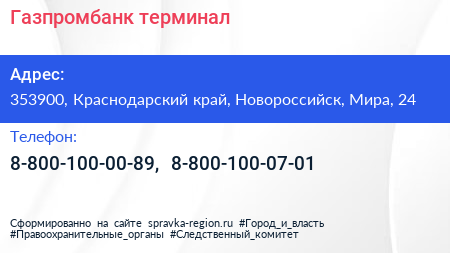 Газпромбанк, терминал по адресу 353900, Краснодарский край, Новороссийск, Мира, 24 в дальнейшем Организация, размещена в следующих категориях:
