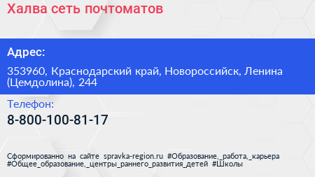 Халва, сеть почтоматов по адресу 353960, Краснодарский край, Новороссийск, Ленина (Цемдолина), 244 в дальнейшем Организация, размещена в следующих категориях: