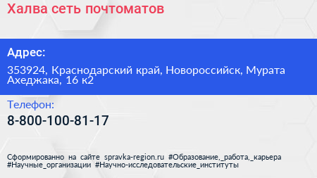 Халва, сеть почтоматов по адресу 353924, Краснодарский край, Новороссийск, Мурата Ахеджака, 16 к2 в дальнейшем Организация, размещена в следующих категориях: