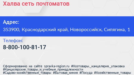 Халва, сеть почтоматов по адресу 353900, Краснодарский край, Новороссийск, Сипягина, 1 в дальнейшем Организация, размещена в следующих категориях: