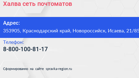 Халва, сеть почтоматов по адресу 353905, Краснодарский край, Новороссийск, Исаева, 21/85 в дальнейшем Организация, размещена в следующих категориях:
