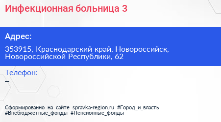 Инфекционная больница №3 по адресу 353915, Краснодарский край, Новороссийск, Новороссийской Республики, 62 в дальнейшем Организация, размещена в следующих категориях: