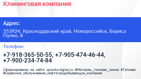 Клининговая компания по адресу 353924, Краснодарский край, Новороссийск, Бориса Пупко, 8 в дальнейшем Организация, размещена в следующих категориях: