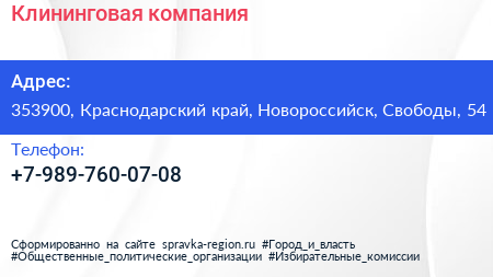 Клининговая компания по адресу 353900, Краснодарский край, Новороссийск, Свободы, 54 в дальнейшем Организация, размещена в следующих категориях: