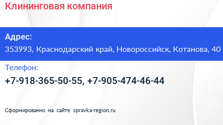 Клининговая компания по адресу 353993, Краснодарский край, Новороссийск, Котанова, 40 в дальнейшем Организация, размещена в следующих категориях: