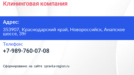 Клининговая компания по адресу 353907, Краснодарский край, Новороссийск, Анапское шоссе, 39г в дальнейшем Организация, размещена в следующих категориях: