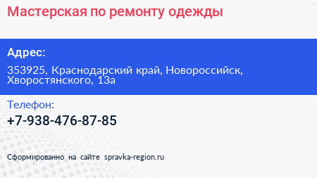 Мастерская по ремонту одежды по адресу 353925, Краснодарский край, Новороссийск, Хворостянского, 13а в дальнейшем Организация, размещена в следующих категориях: