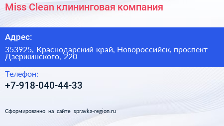 Miss Clean, клининговая компания по адресу 353925, Краснодарский край, Новороссийск, проспект Дзержинского, 220 в дальнейшем Организация, размещена в следующих категориях: