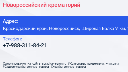 Новороссийский крематорий по адресу Краснодарский край, Новороссийск, Широкая Балка 9 км, 1 в дальнейшем Организация, размещена в следующих категориях: